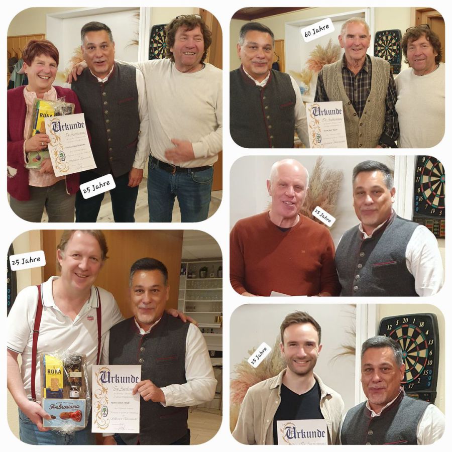 In gewohnt routiniert launiger Weise wurden vom 1.Vorstand Johannes Mayerl und 2. Vorstand Thomas Zach Frau Anneliese Neumann, die Herren Simon Wede, Rainer Daub und Benedikt Hager für ihre 25jährige Vereinszugehörigkeit geehrt. Ganz besonders hervorzuheben war Herr Josef Meyer sen. für seine 60jährige Mitgliedschaft, da ihm vor 10 Jahren ebenfalls von Johannes Mayerl die Ehrennadel angesteckt wurde.